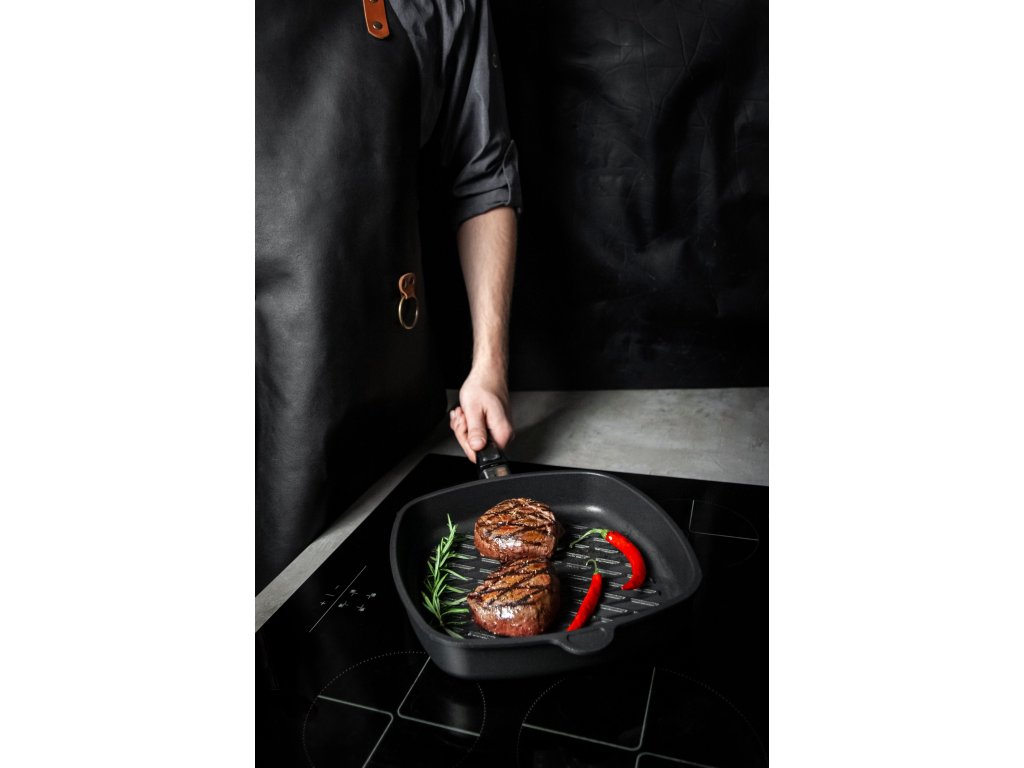Skvělé maso si zaslouží tu nejlepší pánev! Pro milovníky masa není nic uspokojivějšího než vychutnávat si dokonalý steak. Dobrou zprávou je, že si ho můžete připravit sami doma. Jediné, co musíte mít je skvělý kus masa a správnou pánev. Všichni profesionální šéfkuchaři se shodují na jedné věci - nejlepších výsledků dosáhnete s robustní pánví na smažení. Díky speciálnímu vzoru na dně pánve ve tvaru kosočtverce bude váš steak vždy vypadat jako profesionálně připravený šéfkuchařem restaurace.