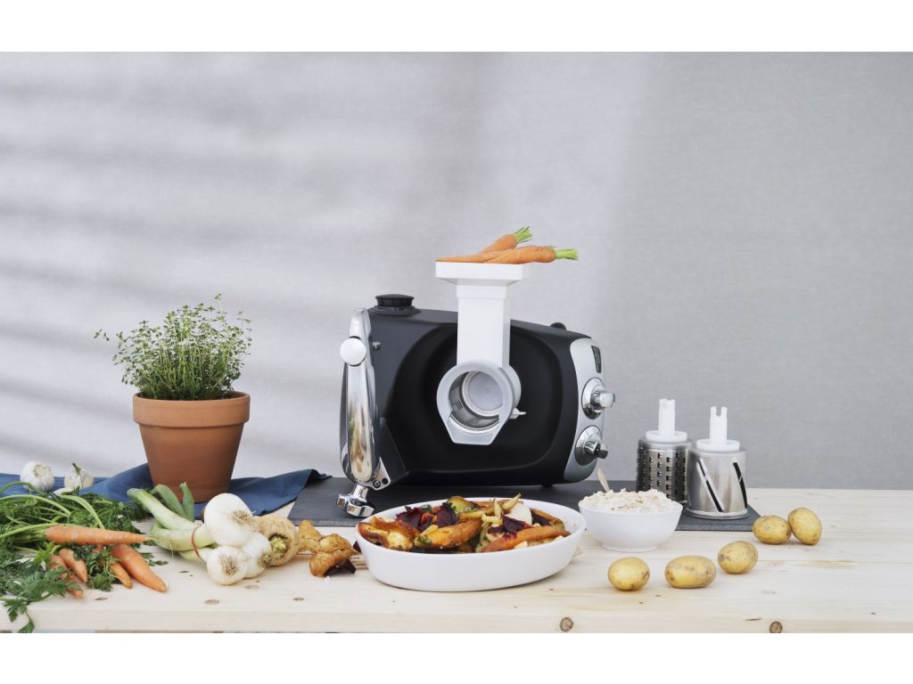 Robot může být položen na stranu, aby se přizpůsobil různým přídavným zařízením zakoupeným samostatně. Díky široké nabídce příslušenství můžete mlít maso, vyrábět těstoviny, odšťavňovat citrusy a bobuloviny, mlít obilí či vyrábět sušenky a mnoho dalšího.