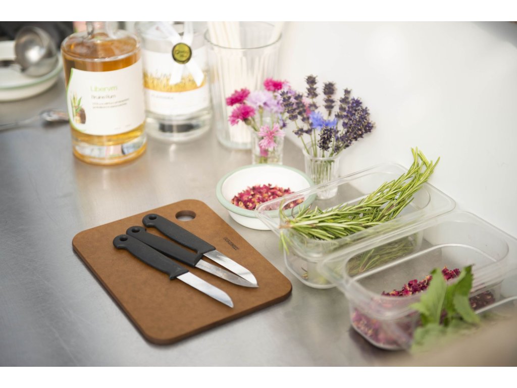 Krájecí prkénka COMBEKK jsou vyrobeny ze 100% recyklovaného papíru. Slisováním vzniká pevný materiál, který můžete znát pod názvem "Richlite". Superpevná, odolná a hladká krájecí prkénka jsou šetrná i k vašim nožům. Snadno se čistí a lze je mýt v myčce nádobí. Otvor v levém horním rohu usnadňuje zvedání krájecího prkénka z rovných ploch a můžete ho použít k servírování menších pokrmů, jako jsou dorty, koláče nebo různé občerstvení.