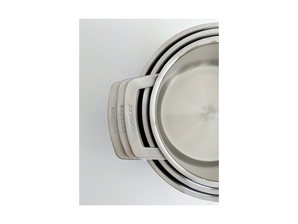 Nerezové hrnce můžete stohovat na sebe, rendlík s nejmenším průměrem nahoru. Design je uzpůsoben tak, aby při skladování hrnce zabírali co nejméně místa.