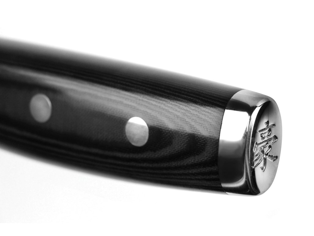 Rukojeť je vyrobena z černé plátnové micarty, což je nesmírně trvanlivý materiál z pryskyřice a plátna. Rukojeť je spojena se střenkou pomocí tří nerezových nýtů. Konec rukojeti s impozantně vyrytou značkou GOU je vyhotoven z nerez oceli a zaručuje vynikající stabilitu. Symetrický tvar rukojeti umožňuje pohodlné a přesné řezání pro praváky i pro leváky.