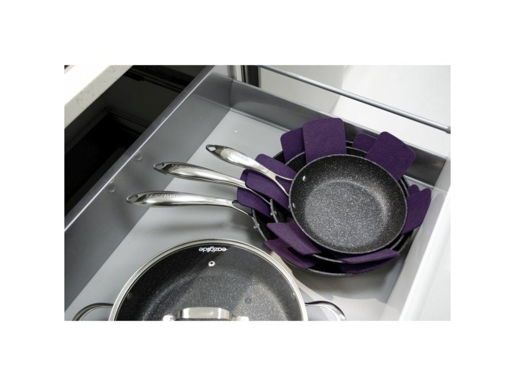 Proložky mezi pánve jsou ideálním pomocníkem, který ochrání nepřilnavé nádobí proti poškrábání a opotřebení, ke kterému dochází zpravidla špatným skladováním pánví na sobě. Měkká ochranná vrstva proložky prodlouží životnost vašeho nádobí. Proložky jsou praktické a vzhledem ke své dostatečné velikosti jsou vhodné i pro větší hrnce nebo pánve.