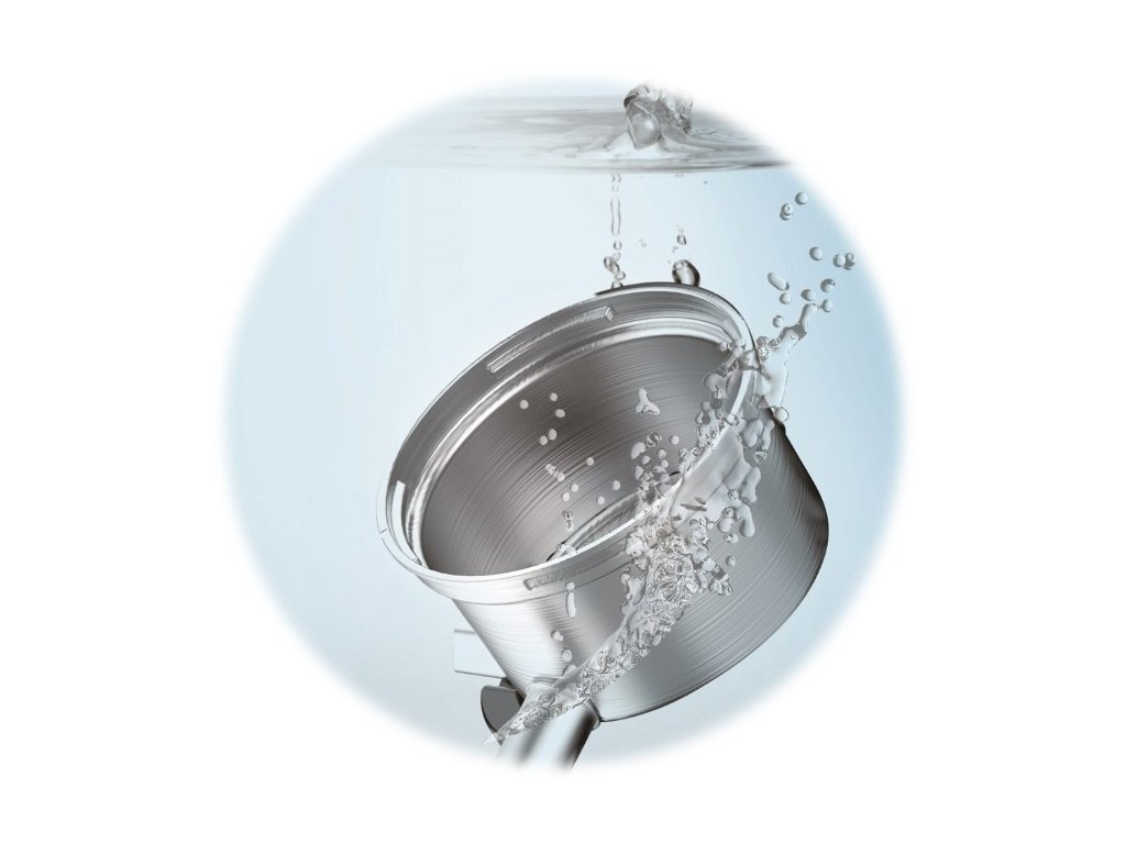 Kromě doporučeného systému střídání dvou komor je čištění lisovacích částí i sítka velmi snadné a rychlé. S díly se díky jejich malým rozměrům snadno manipuluje a stačí je opláchnout pod tekoucí vodou. Na sítko použijte speciálně vyvinutý rotační čistící kartáč dodávaný se standardním příslušenstvím.