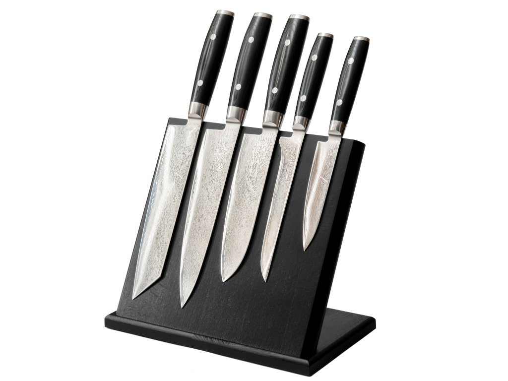 Magnetický stojan na 5 nožů z lakovaného bukového dřeva. Dvě řady magnetů zabudované uvnitř stojanu drží Vaše nože bezpečně na svém místě.