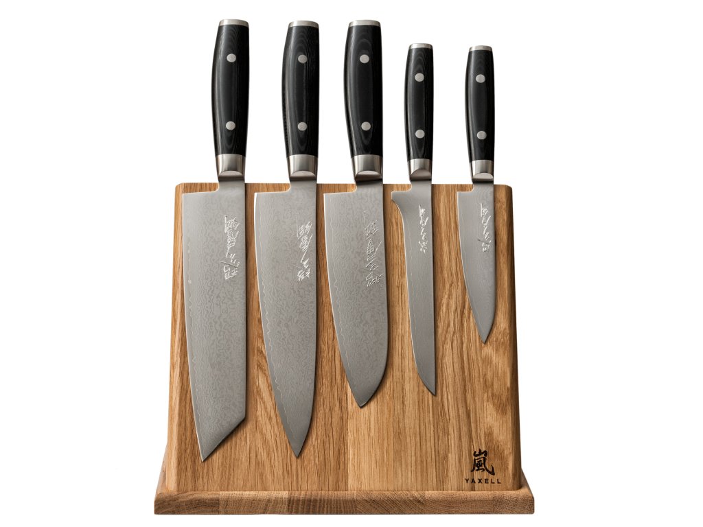 Magnetický stojan na 5 nožů z lakovaného bukového dřeva. Dvě řady magnetů zabudované uvnitř stojanu drží Vaše nože bezpečně na svém místě.