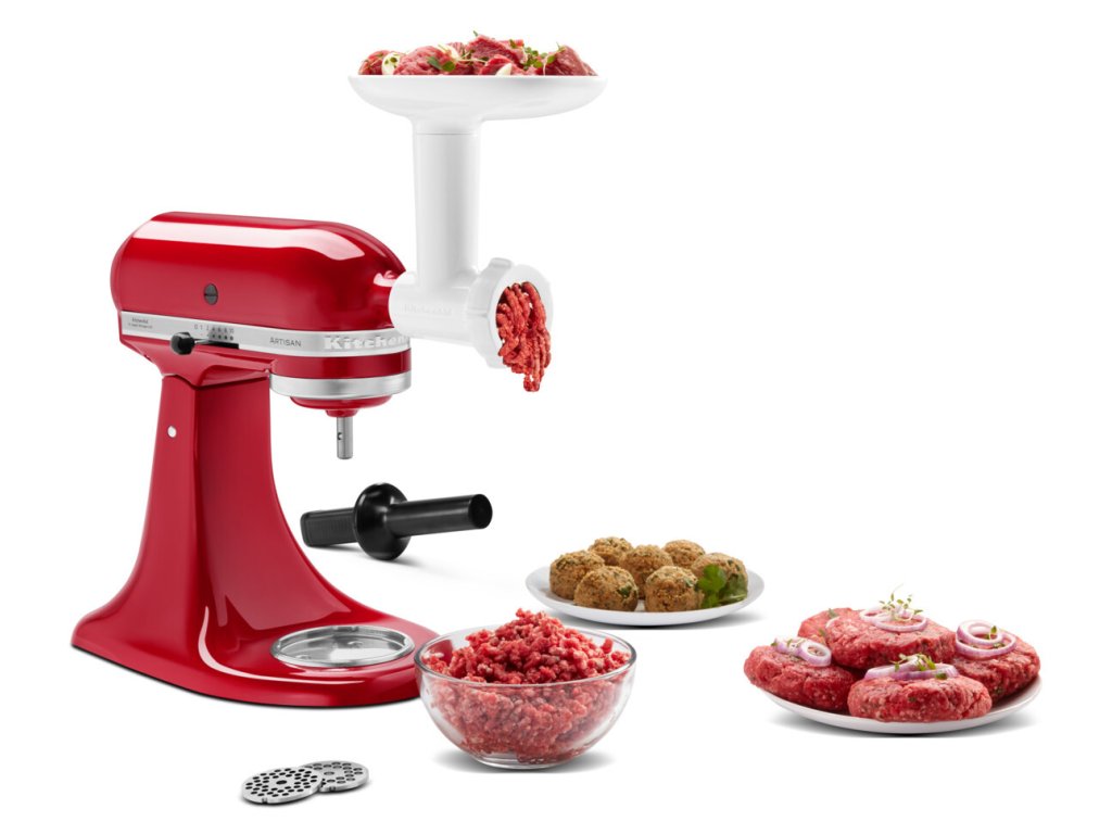 Mlýnek na maso 5KSMFGA s nástavci snadno a rychle zpracuje suroviny, pomůže s přípravou burgerů, paštik, salsy, pomele tvrdé sýry, pečivo a dětem připraví zdravou přesnídávku. Se snadným zatlačení jakéhokoli druhu potraviny směrem k noži pomůže pěchovač. Mlýnek je kompatibilní se všemi modely kuchyňských robotů KitchenAid.