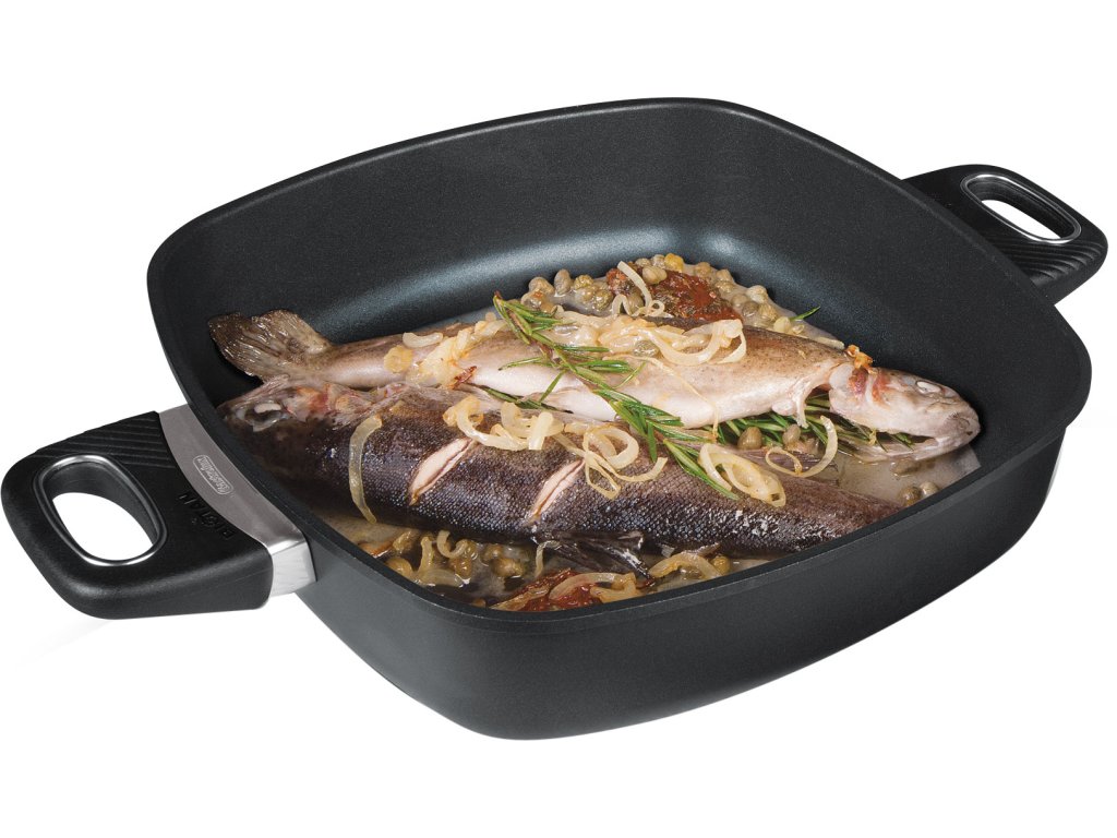 Hranatá pánev má dvě praktická držadla pro snadné přenášení a manipulaci.