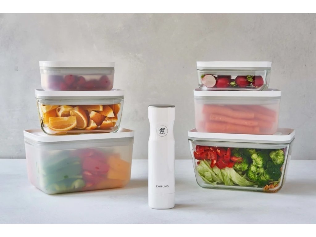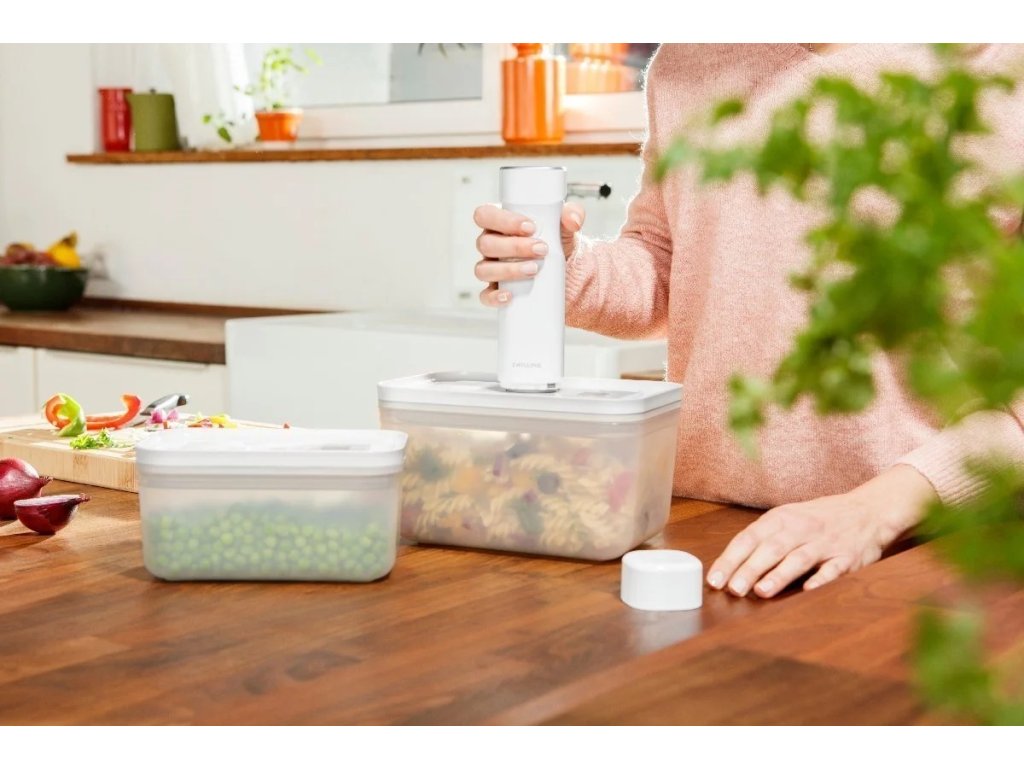 Sada na vakuování Fresh & Save je ekonomický a praktický způsob, jak si vyzkoušet uložení potravin ve vakuovaných obalech, které vydrží čerstvé až 5x delší dobu. Sada obsahuje 2 plastové dózy z poloprůhledného odolného plastu o objemu 1,1 l a 2,3 l s plastovými víčky opatřenými silikonovým těsněním a vakuovým ventilem a 4 ks opakovaně použitelných sáčků ve dvou velikostech (35 x 25 cm a 23 x 20 cm). Sestavu doplňuje nabíjecí vakuová bezdrátová pumpa s jedním tlačítkem.